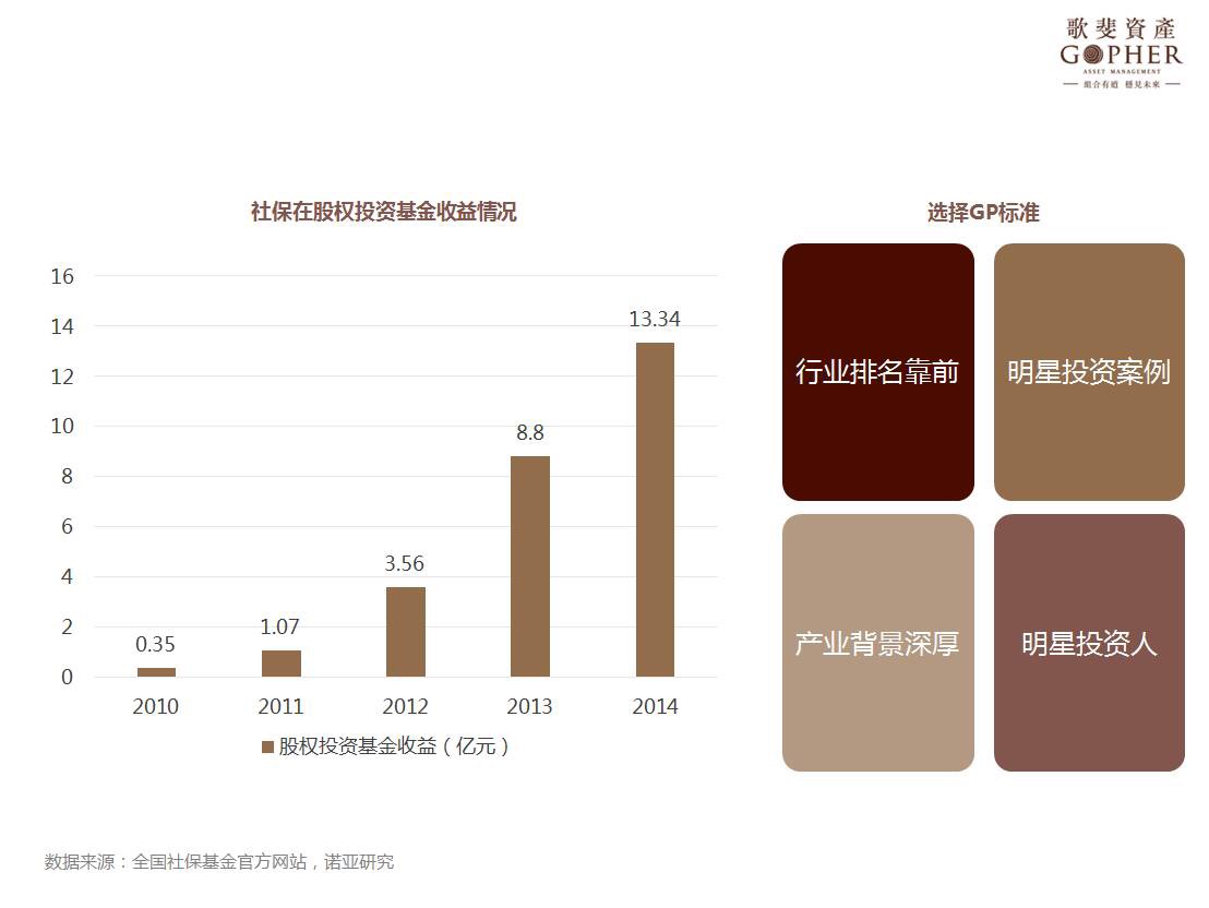 截至 2014 年,社保基金股權(quán)投資基金收益為 13.34億元,年均復(fù)合增長率為 248% ; 同期社保基金的總收入年均復(fù)合增長率為 145%