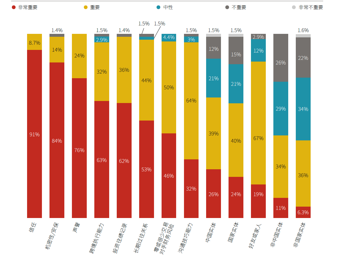 CIO篩選外包服務商的時候信任最重要,最看重的是信任、品牌 、保密性,其后才是優秀的投資業績。選擇金融服務提供商時,在各種標準對選擇金融服務提供商的重要性方面,家族表示信任、機密性 、安全和聲譽是最關鍵的考慮因素,分別有91%、84%和76%的家族表示這些因素非常重要。